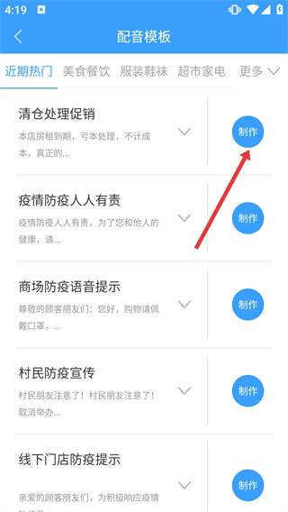 1、点击【配音模板】,进入配音模板页面,可选择近期热门、美食餐饮等分类的模板。