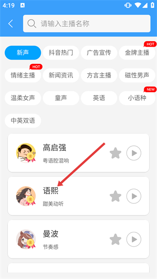 3、在主播选择页面选择主播,进入配音编辑页面。