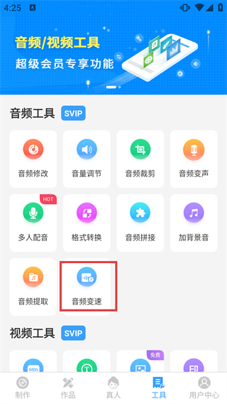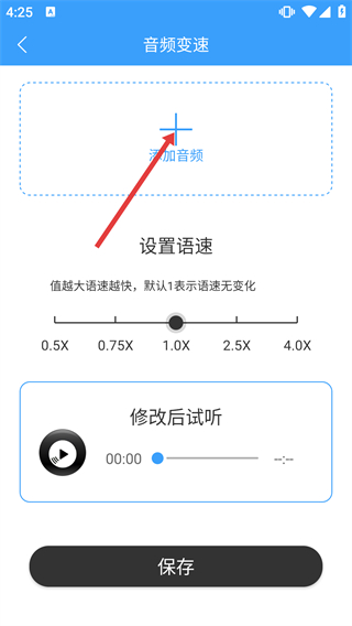 1、点击【音频变速】,进入音频变速功能页面,可添加音频并设置语速。