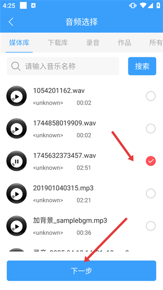 2、在页面中点击【添加音频】,进入音频选择页面,可从媒体库、下载库等选择音频。