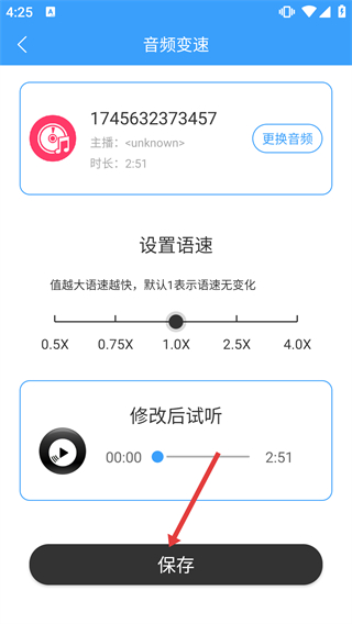 4、设置完成后点击【保存】,完成音频变速操作,可用于调整音频播放速度以适配不同场景需求。