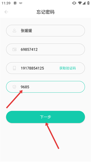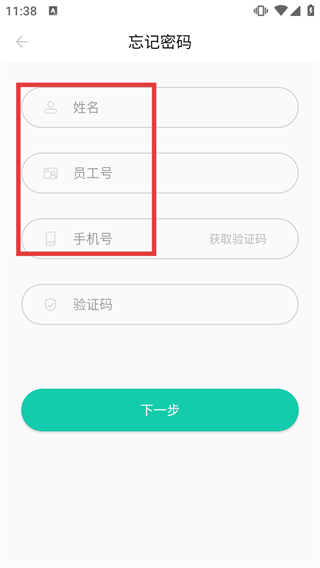 2、在忘记密码页面依次填写姓名、员工号、手机号。