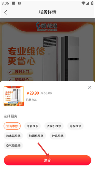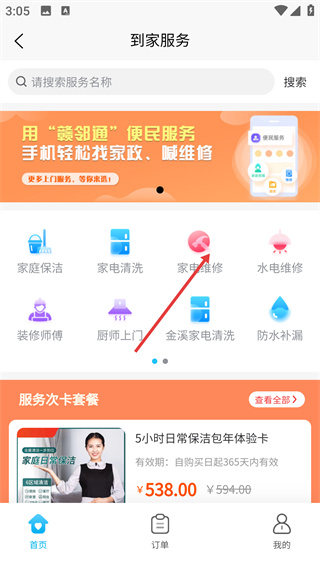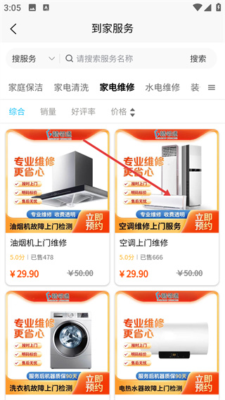 1、在“到家服务”页面点击【家电维修】,进入家电维修服务列表页。