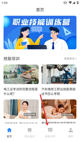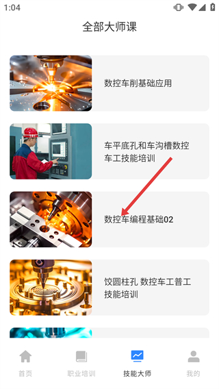 1、打开APP首页,点击底部【技能大师】,进入全部大师课列表,可选择数控类等技能课程。