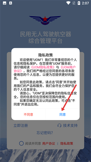 1、使用平台前,需阅读并点击【同意】【UOM隐私政策】与【UOM用户协议】,方可进入登录注册环节。