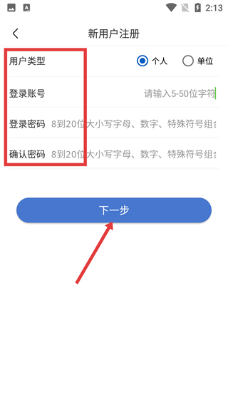 3、在新用户注册页面,选择用户类型,填写【登录账号】【登录密码】【确认密码】,点击【下一步】。