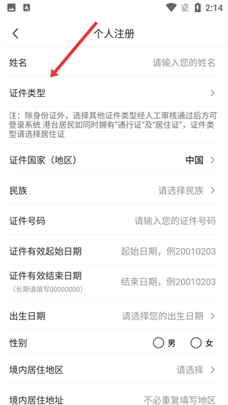 4、进入个人注册页面,依次填写【姓名】【证件类型】等个人信息,完成注册流程。