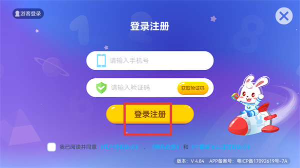 1、进入【兔小贝思维】登录注册页面,输入手机号、验证码,勾选同意相关协议后点击【登录注册】,完成账号登录。