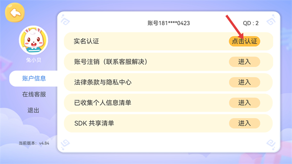 3、在账户信息页面,找到【实名认证】选项,点击【点击认证】,弹出实名认证窗口。