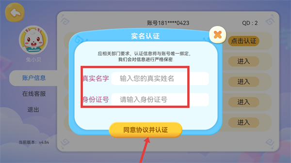 4、在实名认证窗口中,输入【真实名字】和【身份证号】,点击【同意协议并认证】,即可完成实名认证流程。