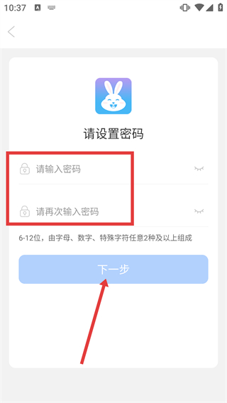 4、在密码设置页面,输入密码并再次确认,点击【下一步】,完成账号注册的密码设置环节。