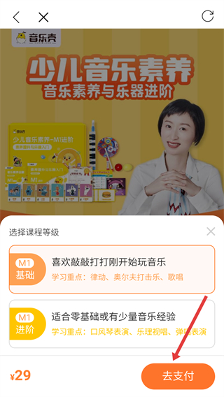 3、选择课程等级后,点击【去支付】,进入支付准备页面。