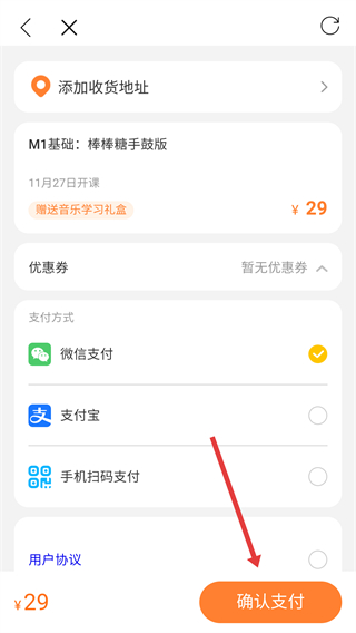 4、添加收货地址,选择支付方式,点击【确认支付】,完成课程购买流程。