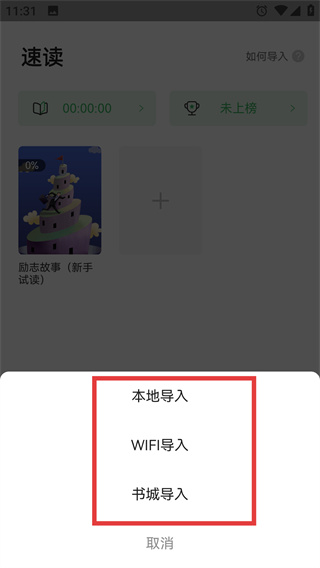 2、在速读页面,点击“+”号按钮,弹出导入方式选择框。