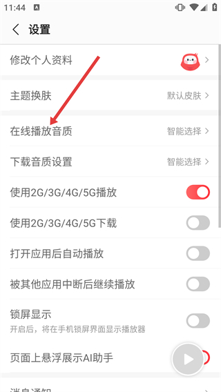 3、在设置界面,点击【在线播放音质】,进入音质选择页面。