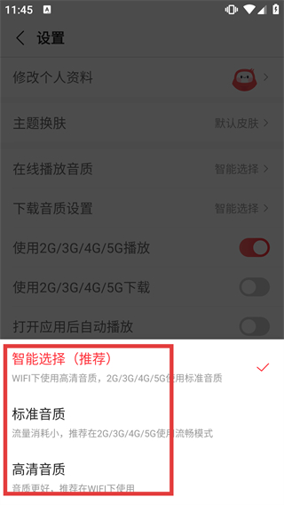 4、在音质选择页面,可选择【智能选择】【标准音质】【高清音质】中的任意一项,完成在线播放音质设置。