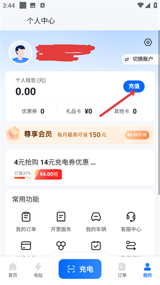 2、在个人中心页面,点击【充值】,进入钱包充值页面。