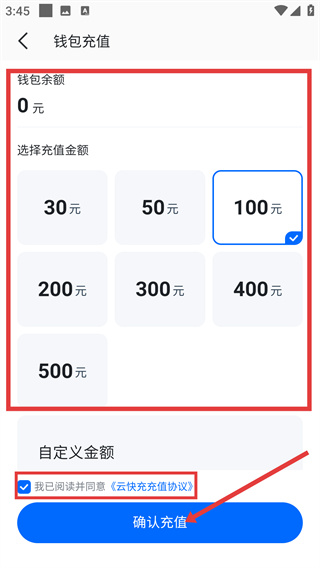 3、在钱包充值页面,选择充值金额,勾选同意《云快充充值协议》后,点击【确认充值】。