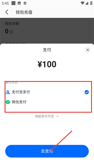 4、在支付页面,选择支付方式,点击【去支付】,完成钱包充值操作。