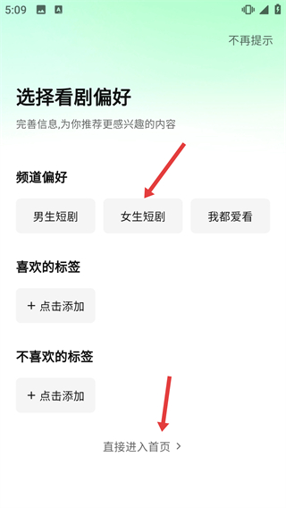 1、在“选择看剧偏好”页面,可选择“男生短剧/女生短剧/我都爱看”的频道偏好,也可直接点击【直接进入首页】按钮,进入应用主界面。