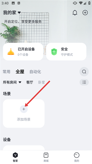 1、在智能家居应用的“我的家”页面,找到场景板块下的“添加场景”按钮,点击进入场景配置页面。