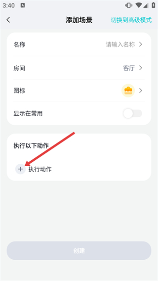 2、进入添加场景页面后,点击“执行动作”选项,进入动作类型的选择界面。