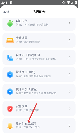 3、在执行动作列表中,选择“给手机发送通知”这一动作类型,进入动作内容的编辑环节。