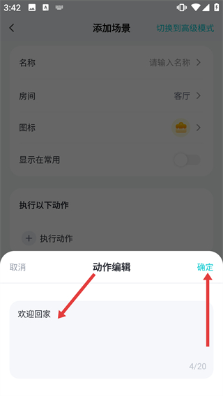 4、在动作编辑弹窗内,输入通知内容,点击“确定”按钮,完成该执行动作的配置。