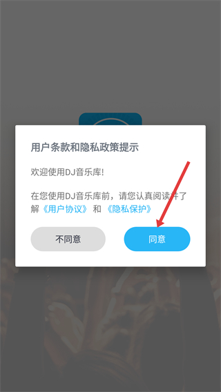 1、打开DJ音乐库后,在弹出的“用户条款和隐私政策提示”弹窗中,点击“同意”按钮,完成协议确认。