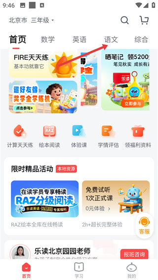 1、在APP首页点击顶部导航栏的【语文】选项,进入语文课程专属板块,该板块按学期分类展示对应年级的语文课程资源。