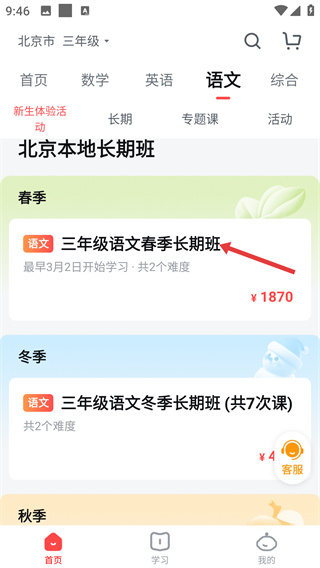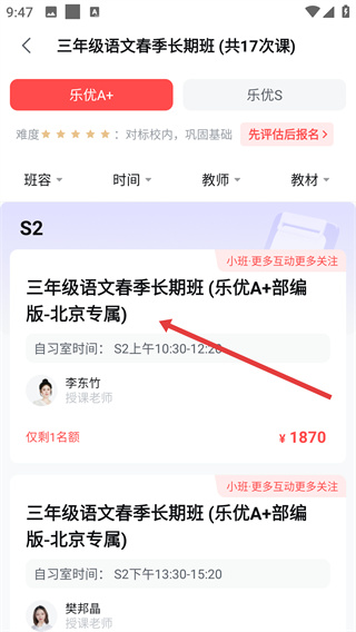 2、在语文板块中选择对应的课程条目,进入该课程的班型选择页面,可查看不同难度(如乐优A+、乐优S)的班型选项。
