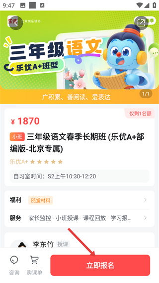 4、在班型详情页面点击【立即报名】按钮,完成该课程的报名操作。