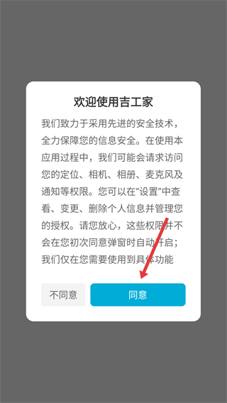 1、打开吉吉家应用后,在弹出的权限提示弹窗中,点击“同意”按钮,完成应用权限相关说明的确认。