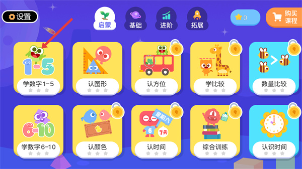 1、在启蒙课程页面点击【学数字1-5】课程卡片,进入数字启蒙学习模块,该模块以具象图案为载体,帮助低龄儿童建立数字与实物的关联认知。