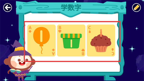 3、在数字匹配环节,识别包含数字“1”元素的选项(如带有数字“1”标识的气球、盒子、纸杯蛋糕)。