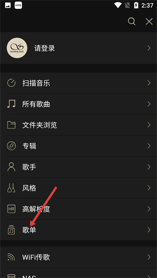 1、在音乐播放界面点击左上角菜单按钮,展开功能侧边栏,可查看【扫描音乐】【所有歌曲】等音乐相关功能选项。