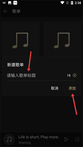 4、在弹出的【新建歌单】弹窗中输入歌单标题,确认内容后点击【添加】按钮,完成新的歌单创建。