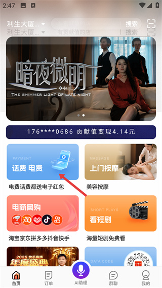 1、在应用首页点击【话费电费】选项,进入生活缴费功能页面。