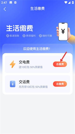 2、在生活缴费页面中,找到“交电费”选项并点击对应的【去缴费】按钮,进入对应地区的电费缴纳专属页面。