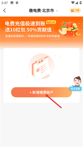 3、在缴电费页面点击【+新增缴费账户】按钮,进入电力机构选择环节,电费缴纳需关联对应地区的电力运营机构。
