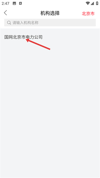 4、在机构选择页面,选择对应的电力公司,完成缴费账户的机构关联,为后续电费缴纳做准备。