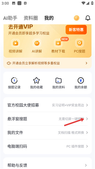2、在个人中心页面中找到【悬浮窗搜题】选项并点击,进入该功能的设置页面。