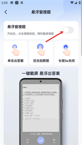 3、在悬浮窗搜题页面,点击“悬浮窗搜题”对应的开关按钮,触发浮窗权限的开启提示。