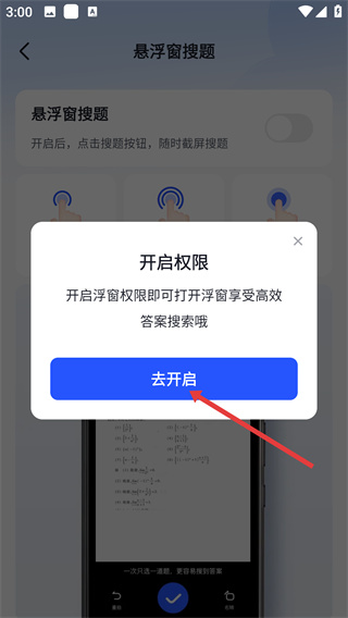 4、在弹出的“开启权限”提示框中,点击【去开启】按钮,进入系统权限设置界面,完成浮窗权限的授予,即可启用悬浮窗搜题功能。