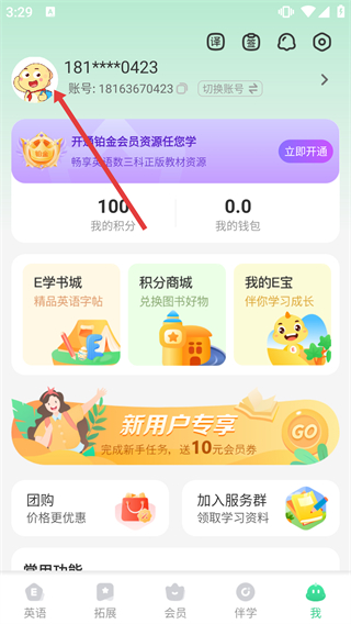 1、在应用主界面点击底部的【我】,进入个人中心页面,可查看【我的积分】【E学书城】等个人相关功能入口。