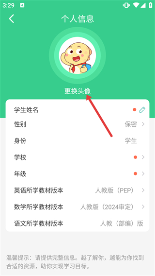 2、在个人中心页面点击头像区域,进入【个人信息】页面,可查看或编辑学生姓名、教材版本等信息。