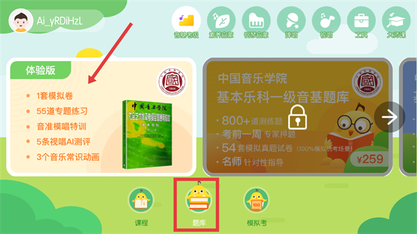 1、在应用主界面找到【题库】选项并点击,进入题库功能页面,可查看体验版包含的模拟、练习等学习内容。