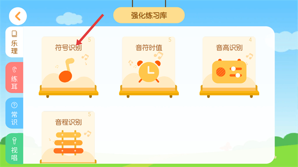 3、在强化练习库的分类界面中,选择【符号识别】等乐理相关的练习模块,进入具体的练习分类页面。