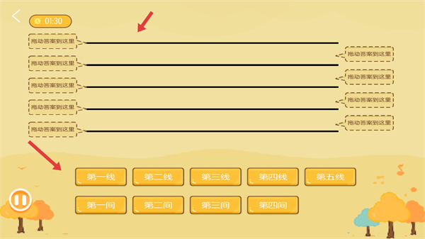 4、进入符号识别的练习界面后,按照提示拖动对应元素到指定区域,或选择下方的线/间选项,完成该模块的练习操作。