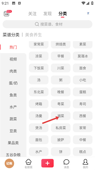 2、进入【分类】页面,左侧可选食材类,右侧点【湘菜】等菜系分类,结合食材与菜系精准定位对应菜谱资源。